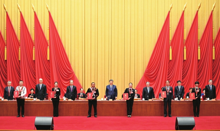 在欢快的乐曲声中,习近平等为受表彰的模范个人和模范集体代表颁奖。